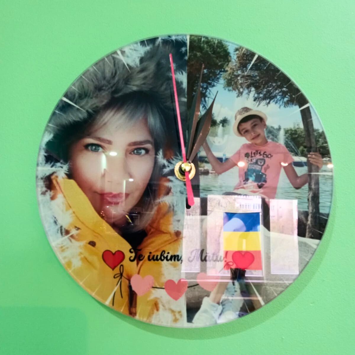 Urmărind opțiunile de personalizare, se poate opta pentru un ceas din sticlă sau unul din mdf și se pot încărca 1, 2, 3 sau 4 fotografii, după preferințe.