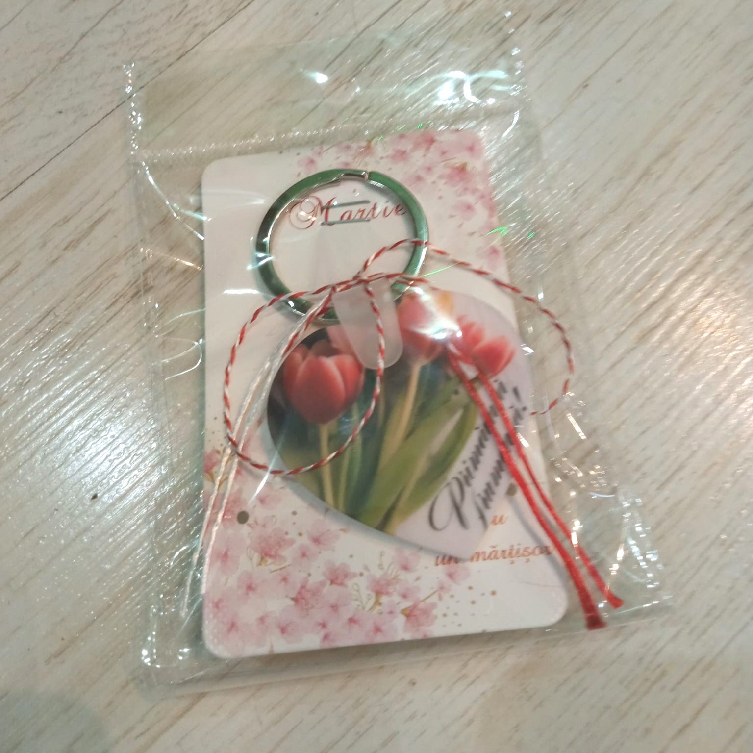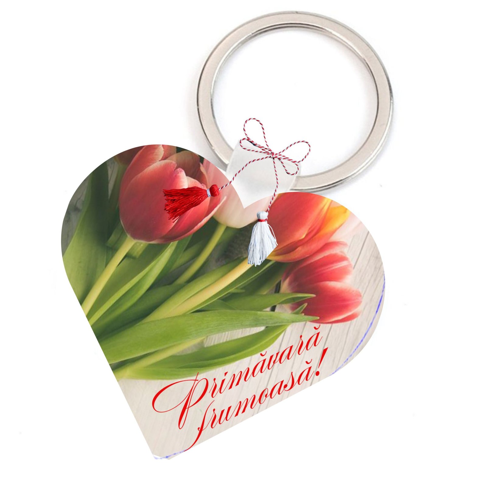 Mărțișor tip breloc, în formă de inimă, print lalele