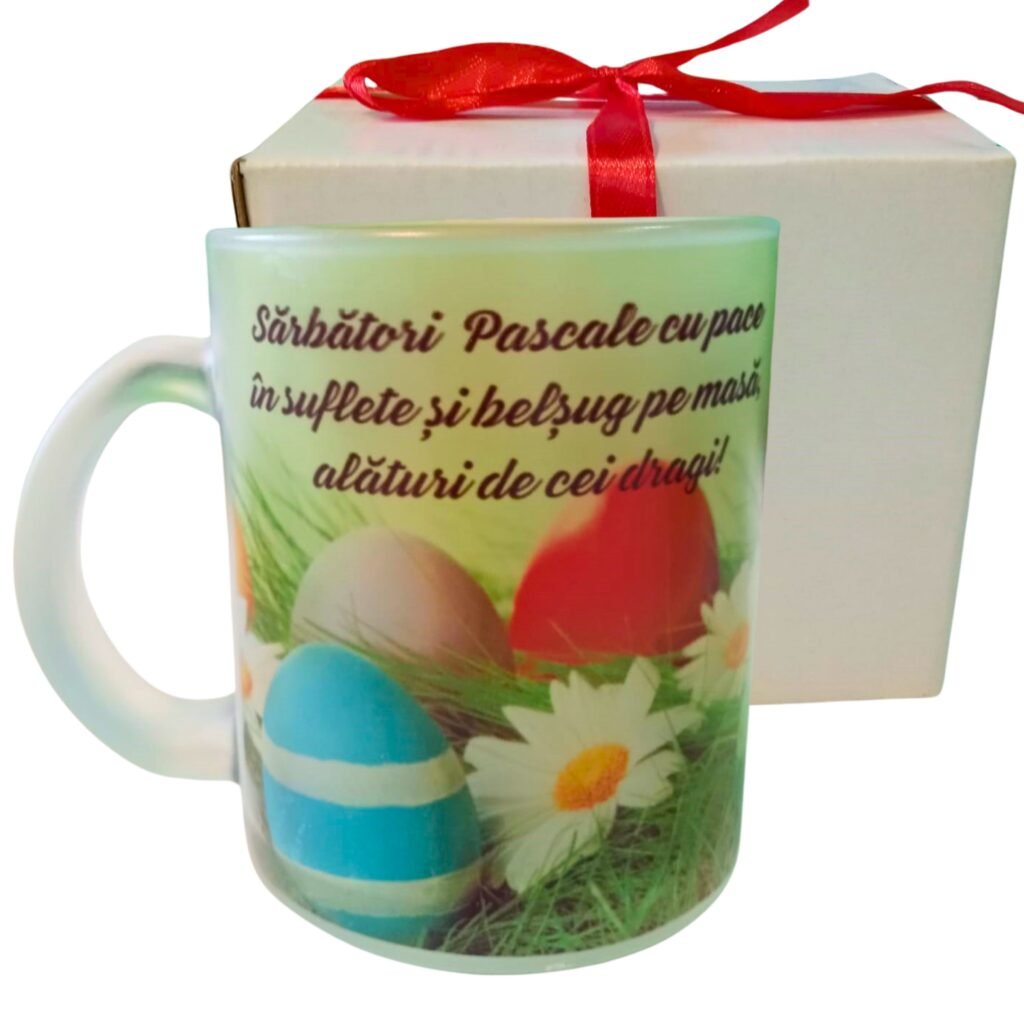 • Cană din sticlă sablată cu mesaj de Paște
