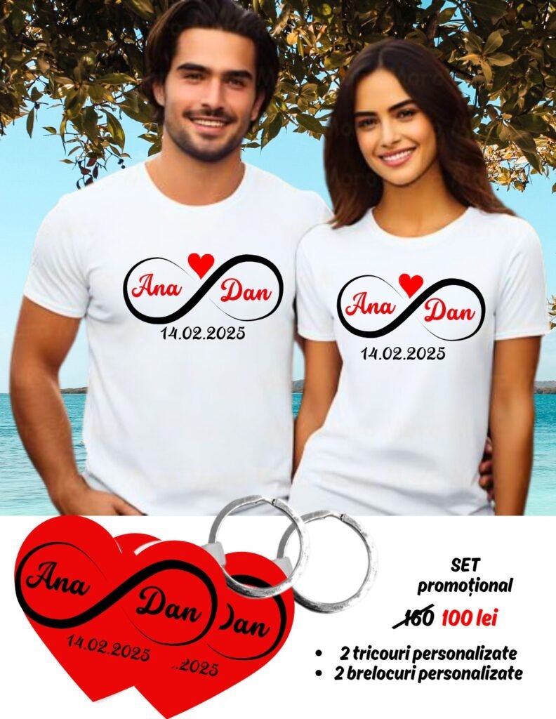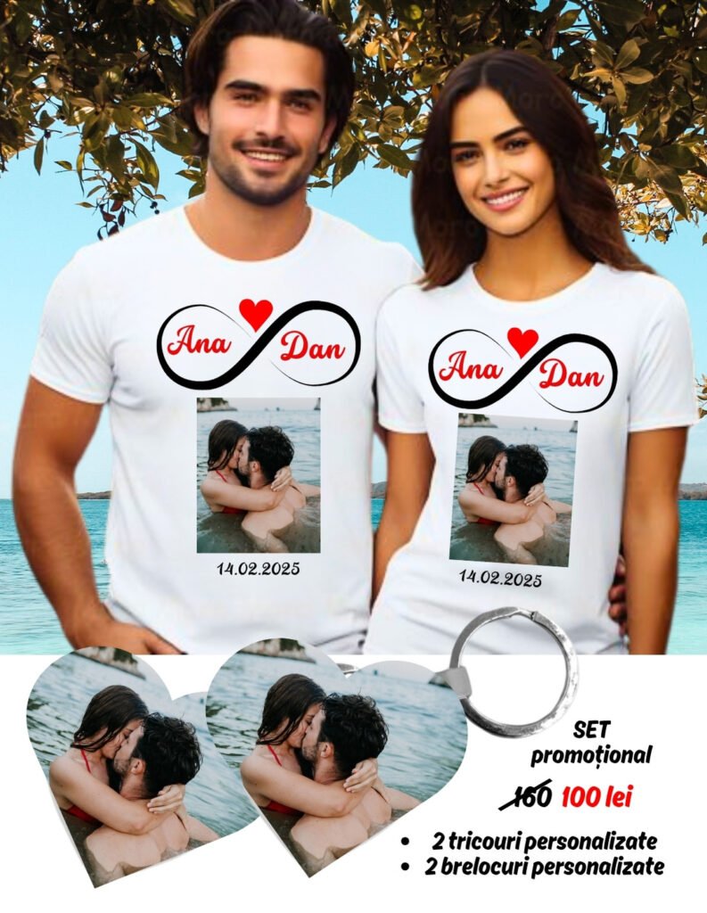 • Set 2 tricouri personalizate, pentru cuplu și 2 brelocuri personalizate cadou